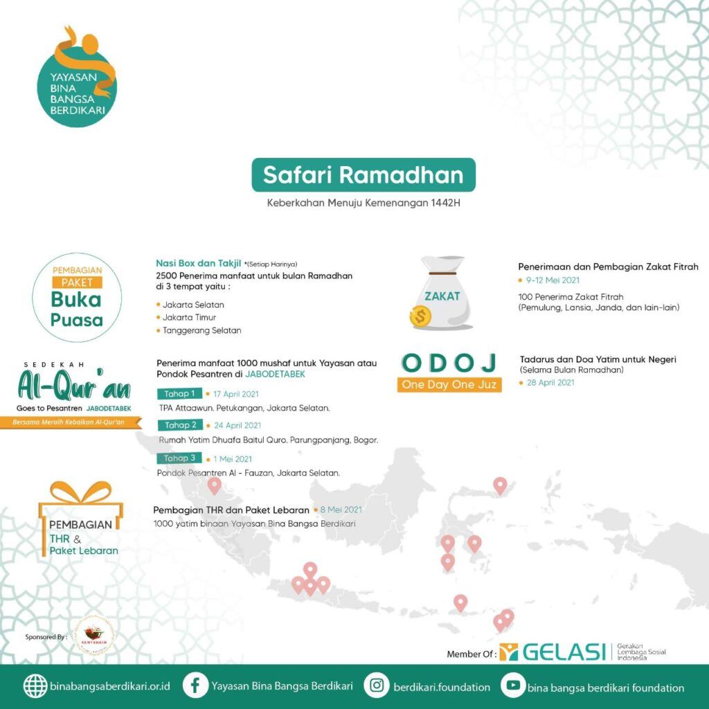 Ramadhan merupakan bulan yang penuh berkah, dan hendaknya keberkahan ini diisi dengan berbagi kebaikan untuk orang lain. Oleh karena itu, Ramadhan tahun ini Yayasan Bina Bangsa Berdikari melakukan serangkaian kegiatan yang berjudul Safari Ramadhan dengan tema “Raih Keberkahan Menuju Kemenangan 1442 H”.